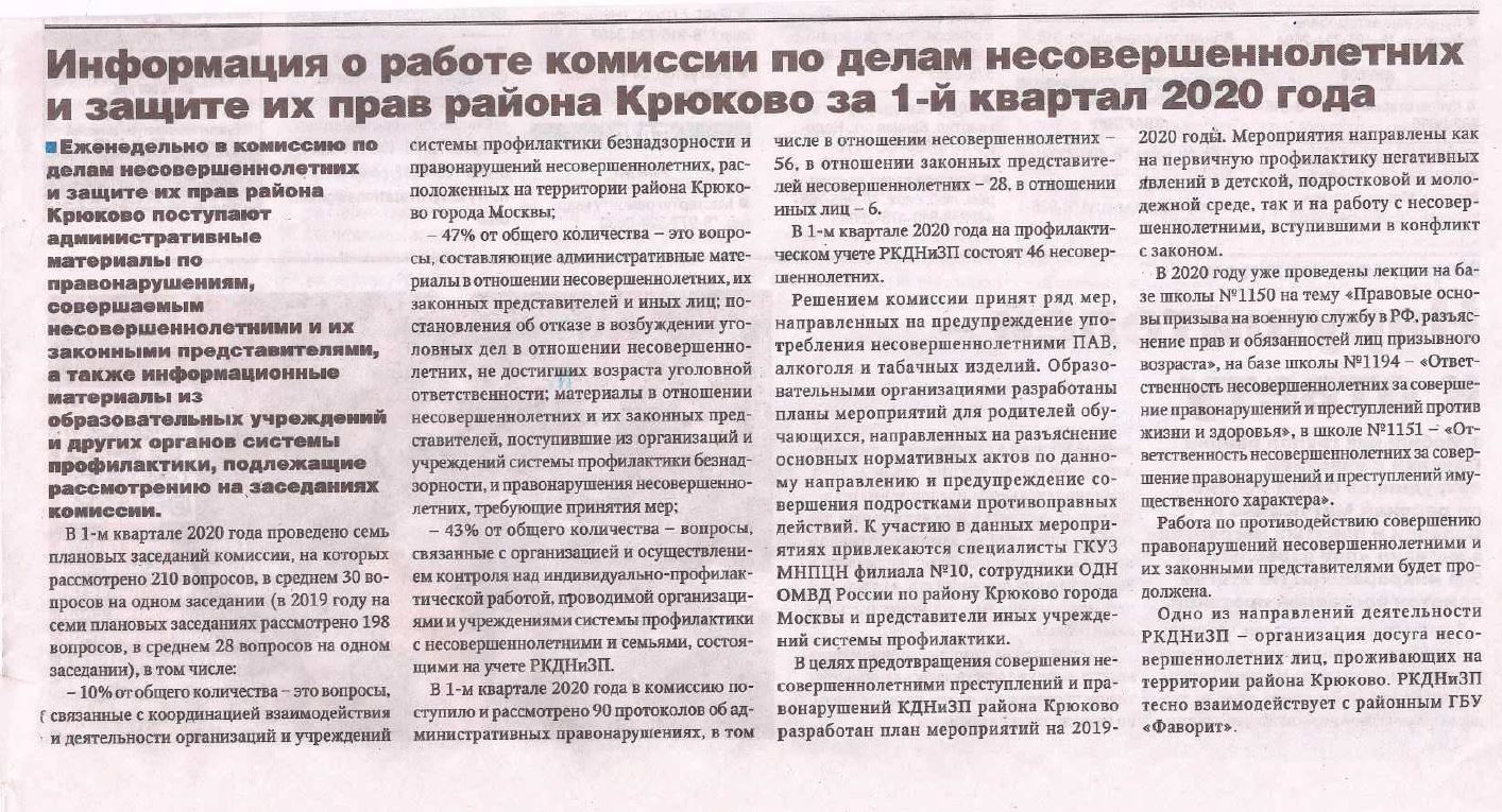 Информация о работе комиссии по делам несовершеннолетних и защите их прав района Крюково за 1-й квартал 2020 года